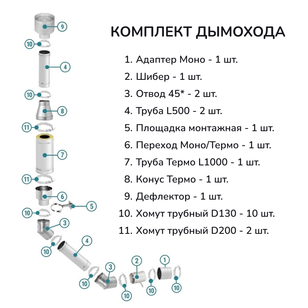 Все модели банных чанов и купелей SCANDINAF комплектуются качественными составными сэндвич дымоходами из нержавеющей стали. Внутренний диаметр в 130 мм обеспечивает хорошую тягу печи, а толщина нержавеющей стали в 0,8-1 мм защищает дымоход от прогорания и обеспечивает долгую эксплуатацию. Сэндвич элемент дымохода защищает от ожогов, а дефлектор с ветрозащитой защищает - территорию вокруг чана от продуктов горения, искр и пепла. Сборка дымохода осуществляется согласно инструкции и не занимает много времени.