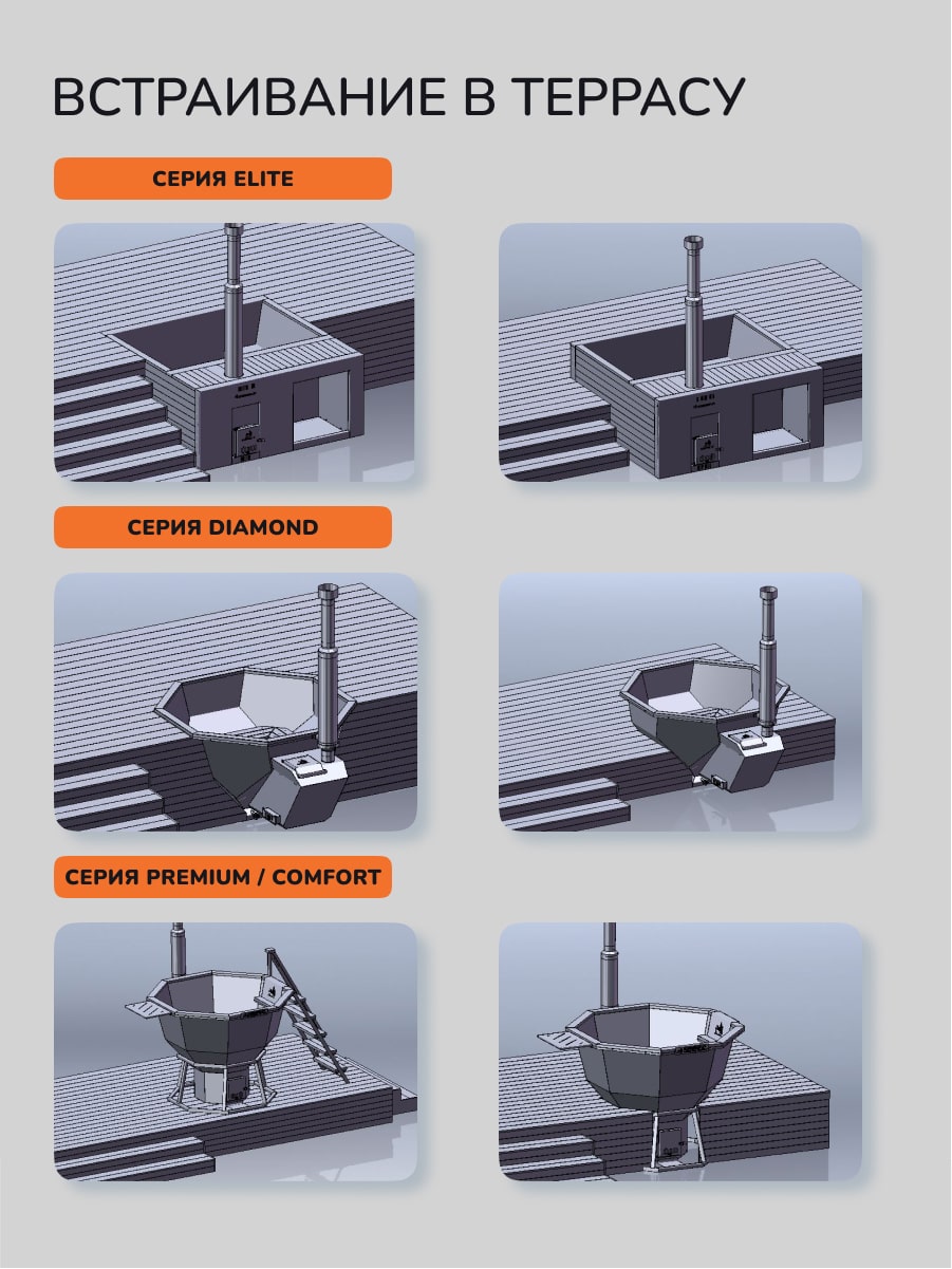 Банные чаны и купели на дровах SCANDINAF серии Comfort, Furako, Diamond, Thermal и Elite – диаметром 170, 190 и 200 см рассчитаны на использование до 10 чел. Использование банных чанов зимой позволит вам окунуться в незабываемую атмосферу целого СПА комплекса на вашем участке, а летом подарит приятную прохладу телу в жару и возможность детям резвится в воде целый день. Различные комплектации и формы нашей серии позволят вам выбрать лучший банный чан SCANDINAF для вашего дома, бани и сауны.